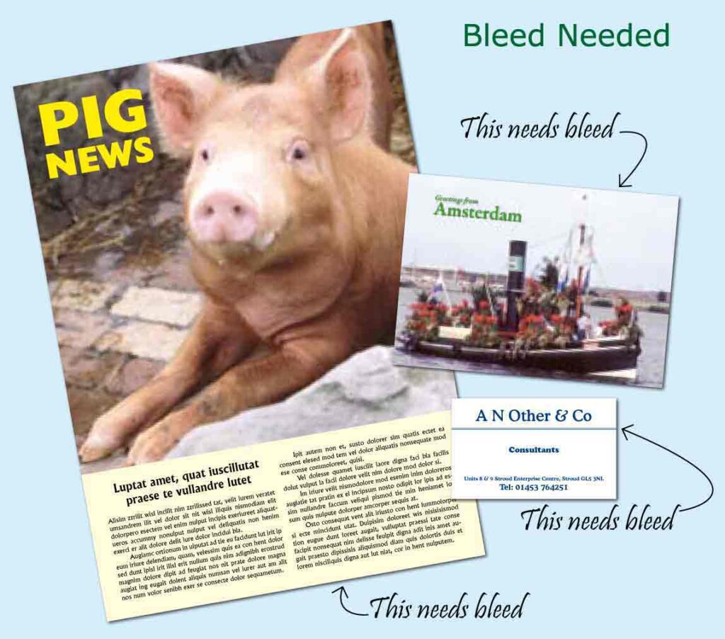 Page bleed ensures that there are no slivers of paper colour, often white, visible on the edge of finished print work. Printing presses, whether conventional or digital, can’t print right to the edge of a sheet of paper. So, if we need to print up to the edge of a sheet, we must over print on oversized paper and then trim down to the desired size. Neither printing or cutting is a totally exact process, so the page bleed is used to compensate for the small processing errors which may occur.