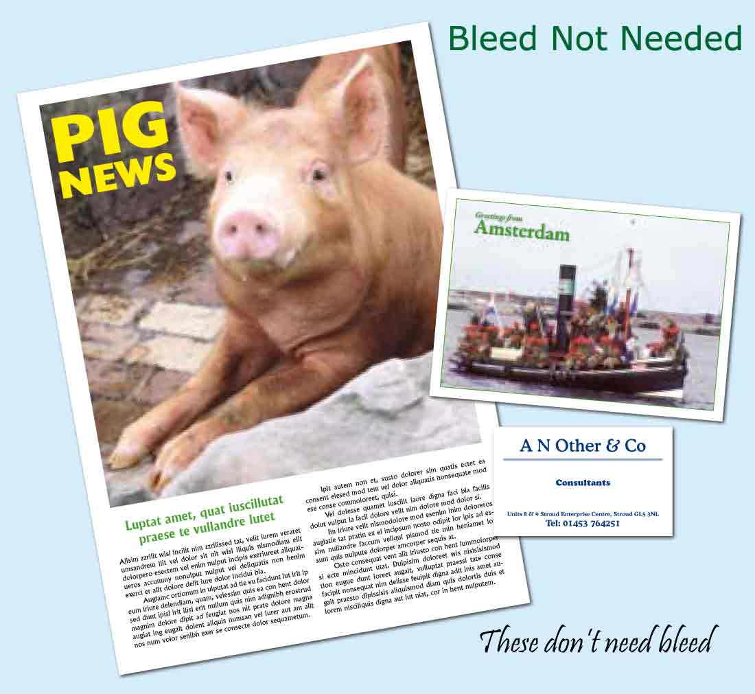 Printing processes vary in their accuracy, so it is a good idea to make a greater allowance than is normally necessary. Typically we use 1/8 inch (3 mm) bleed on each side of a job. This means that any element on a page which is intended to print to the edge – graphics, picture, background colour, or whatever – must continue 1/8 inch (3 mm) over the edge of the page. This additional information will be trimmed off when the job is finished. In addition to the bleed outside the edge of a page, it is usual to allow a “safety zone” inside the edge of a page. Any important elements, such as text or graphics, which are intended to be contained on the page and not bleed off should be kept inside this zone. The size of this zone will vary according to the printing process, but should be a minimum of 1/8 inch (3 mm). If you can allow a larger safety zone, say 1/4 inch (5 mm), it often gives a better visual appearance. It is also necessary to be aware that some machines have larger unprintable areas at the edge of the sheet. This is particularly important when designing jobs that do not have bleed and will be printed on “pre-cut” (“cut-size”) sheets, i.e. normal 8.5×11 inch (A4) paper. Here it is usually necessary to extend the safety zone, or margin, to 1/4 inch (5 mm) or more. We can provide more precise information depending on the job to be printed.