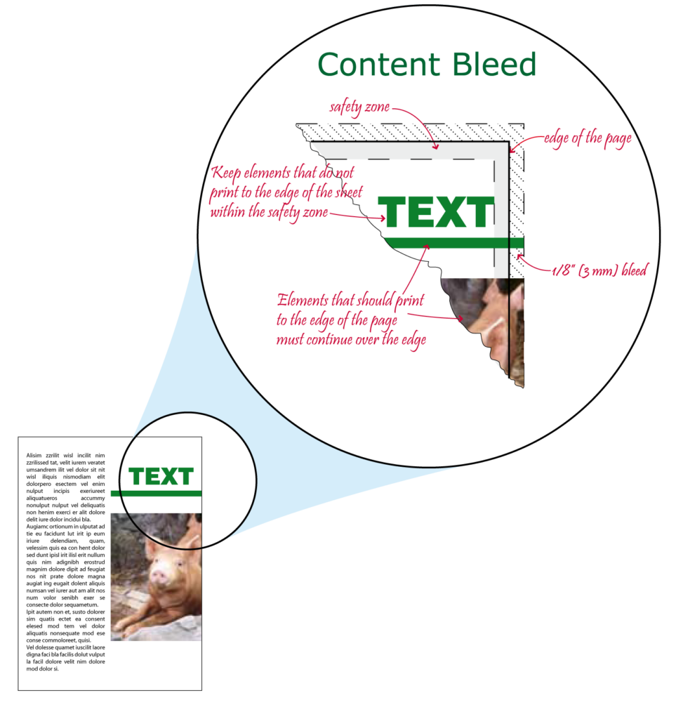 A page is said to bleed when the background or page content extends to the edge of the page with no margin. In these cases the content needs to be adjusted to extend beyond the edge of the page. Your page content needs to run beyond, “bleed”, past the edge of the desired page size. The jobs in the two images below show when bleed is and is not needed. If your job has an empty margin on all edges, then bleed is not needed.