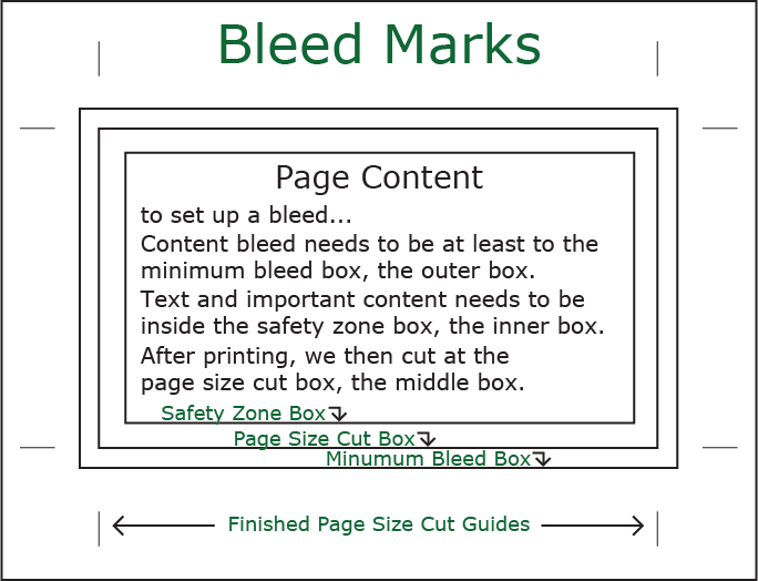 In the image below, The outer box bleed marks indicate the minimum extent bleed content needs to reach. The middle box indicate the border of the desired finished page size and are usually not designated by any solid or dashed lines The bleed marks extending out from the corners are inline with the desired page size border and are used as a cutting guide by the print shop. The inner box bleed marks are used to the indicate the safe zone where content will not be clipped by printing and cutting errors. The inner box bleed marks can also indicate the maximum printable area, because some printers are not capable of printing close to the edge of a page.